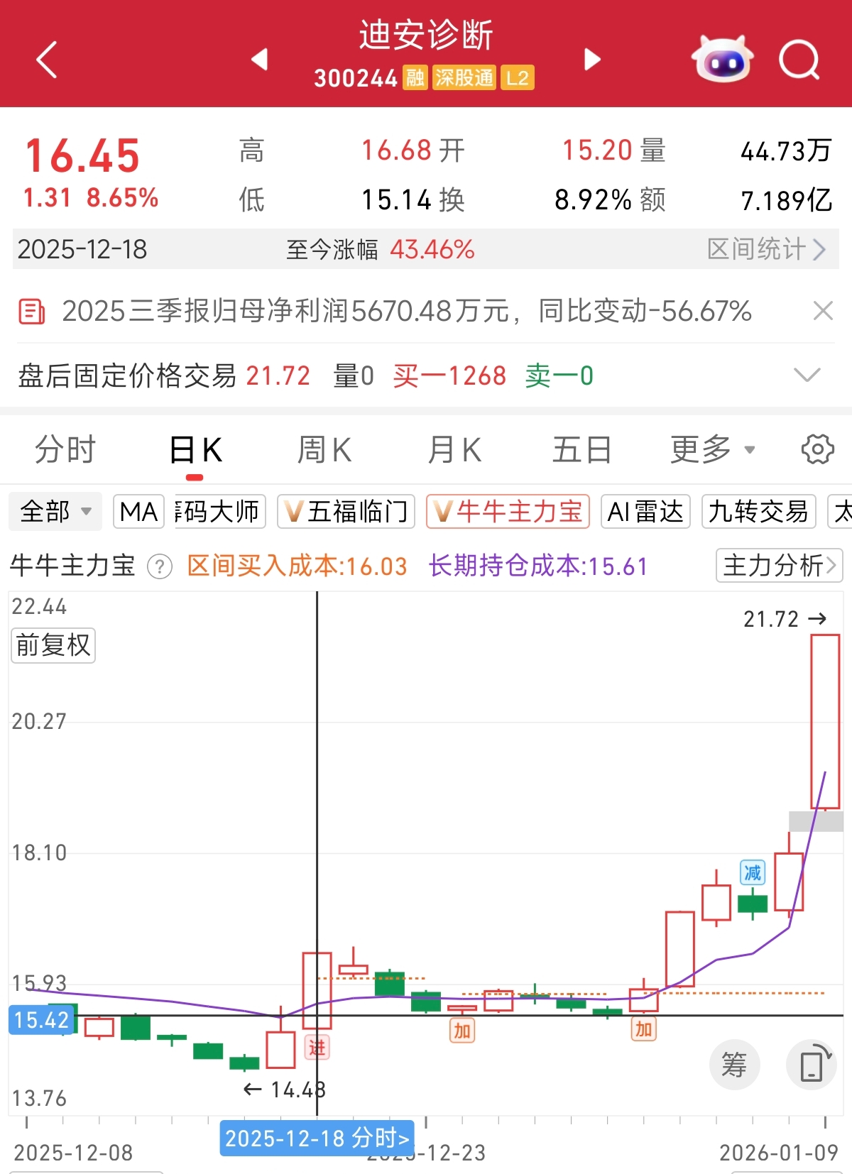 根据“主力宝”监控,AI医疗诊断概念股迪安诊断,主力在12月18日进场,中间进行了1次减仓和2次加仓,目前已经上涨43%。