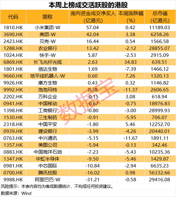从成交净买入金额来看,南向资金对大型科技股流向不一,小米集团-W本周获南向资金净买入金额最高,达到57.04亿港元,近两周南向资金净买入累计金额超过100亿港元,其他还有美团-W本周获南向资金净买入金额42.04亿港元,阿里巴巴-W遭南向资金净卖出31.21亿港元,腾讯控股净卖出16.02亿港元,中芯国际净卖出10.84亿港元。