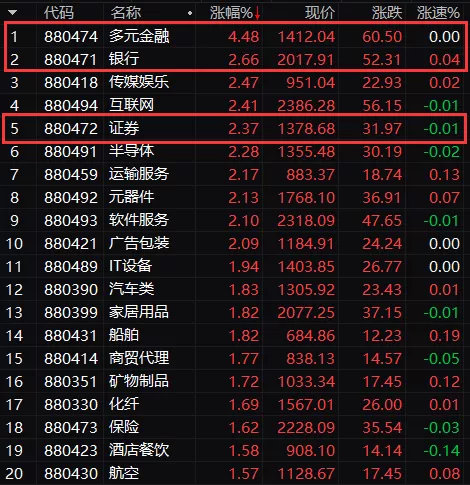 截至券商中国发稿,多元金融板块涨逾4%,位居两市板块涨幅榜首,银行板块和券商板块涨幅均超过2%。