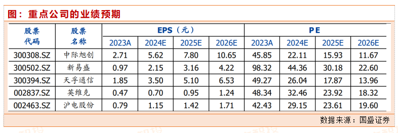 国内方面,主要光通信公司业绩预告均已发布,中际旭创预计实现净利润21.5-25亿元,同比增长250%-307%,随着800G的持续放量,以及供应链的稳定,我们判断公司后续经营质量有望持续稳健提升,利润水平有望持续向好;新易盛预计实现净利润8.1-9.5亿元,同比增长181%-229%,我们判断主要是产品逐步从400G向800G切换,收入实现大幅度增长;天孚通信预计实现净利润6.3-6.8亿元,同比增长167-187%,我们判断下游客户产能陆续释放,供给紧张的情况仍将持续,器件产能利用率和利润率将有望维持较高水平。