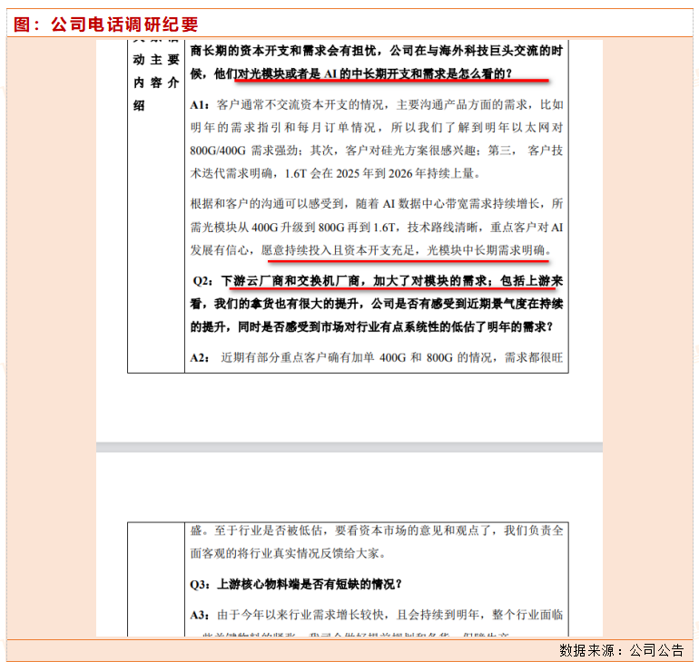 整体来看,2024年是核心公司业绩加速释放的过程,阿尔法行情坐实,业绩有保证。而且近期针对市场担心的问题,中际旭创也重点解释了当下投资关心的问题,包括光模块的需求、资本开支等问题,也侧面印证了公司没有多少变化,还是整体情绪的影响,公司业绩全年有保证。