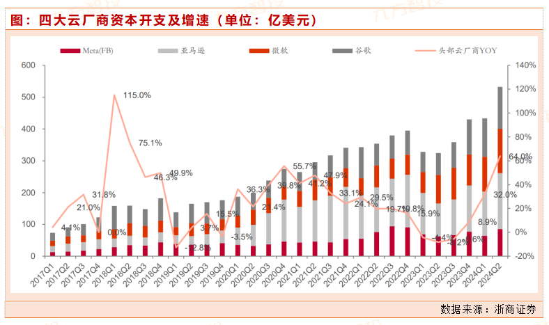 一般而言,这种核心产业链成长公司,一般上游的资本开支是下游的营收水平,而从近期的海外云厂商近期集中公布的财报来看,资本开支并未明显变化。四家云厂商24Q2资本开支为532亿美元,同比+64%,环比+23%,超出彭博一致预期的496亿美元7.3%。