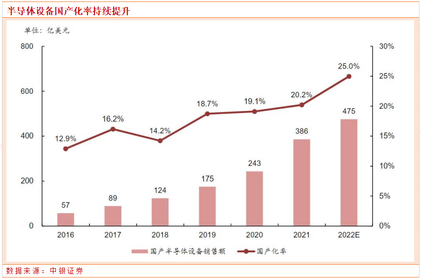 根据中国电子专用设备工业协会统计,2021年中国大陆主要国产半导体设备销售额达到386亿元,国产化率约20%;预计2022年国产化率将上升到25%。根据芯谋研究数据,半导体设备零部件国产化率依然不高。晶圆制造的突破核心在于设备,设备的突破核心在于零部件。