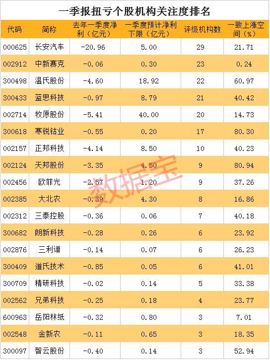 数据宝统计显示,今年一季度净利润有望扭亏个股共有80多只。以预告净利润下限计算,牧原股份、温氏股份、蓝思科技等个股一季报净利均有望超过亿元。