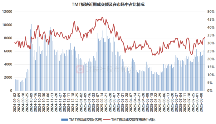 注:TMT板块近期成交额及在市场中占比情况(截至8月14日收盘)