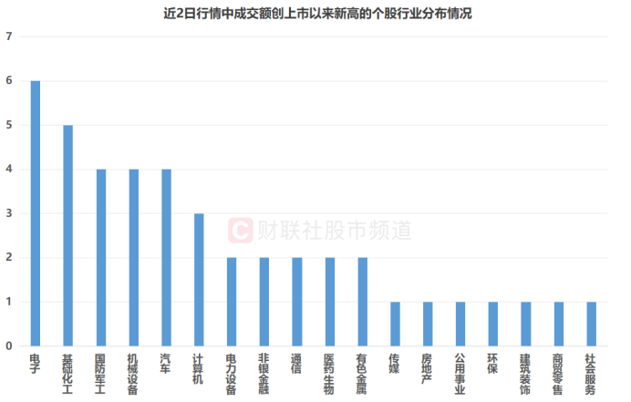 注:近2日行情中成交额创上市以来新高的个股行业分布情况(截至8月14日收盘)