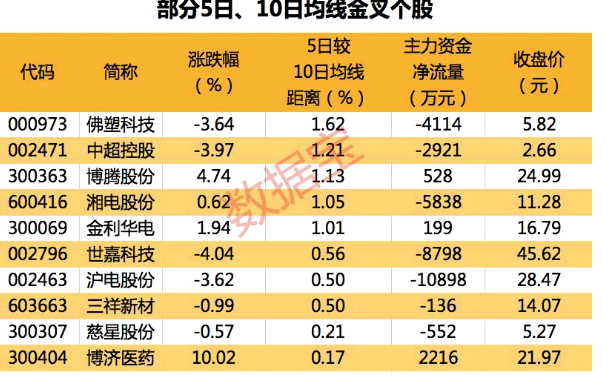 截至3月11日收盘,有12只A股的5日均线主动上穿10日均线,其中佛塑科技、中超控股、博腾股份等个股的5日均线较10日均线距离最大,分别达1.62%、1.21%、1.13%。