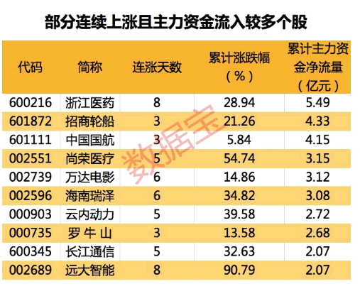 值得注意的是,88只连续上涨个股中,19只个股期间主力资金累计净流入超过亿元。其中,累计资金流入最多的为浙江医药,主力资金累计流入5.49亿元。