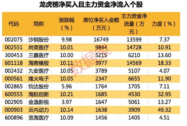 速看!龙虎榜净买入且主力资金净流入个股一览