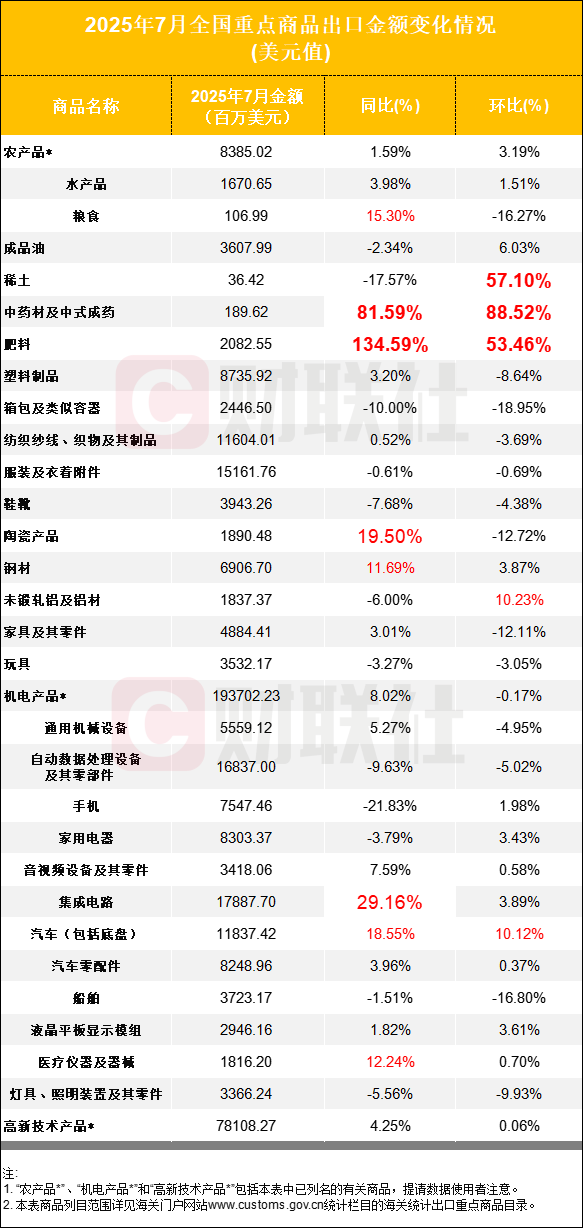 7月重点商品出海数据出炉:集成电路、汽车同比强势连增!稀土环比增超五成