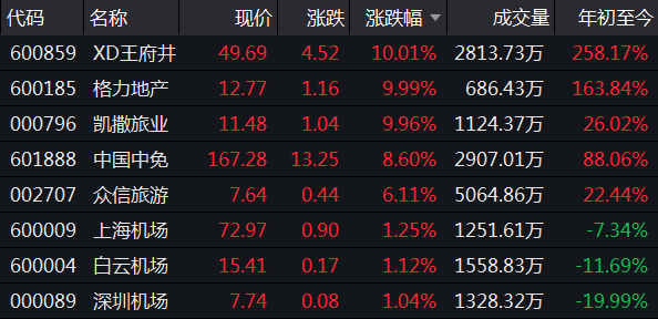 延续强势,免税概念今日盘中继续发力拉升。截至收盘,王府井、格力地产、凯撒旅业等涨停。中国中免涨近9%,众信旅游涨逾6%。