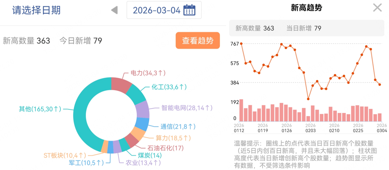 从百日新高去看,板块新高数量前4:电力>化工>智能电网>通信