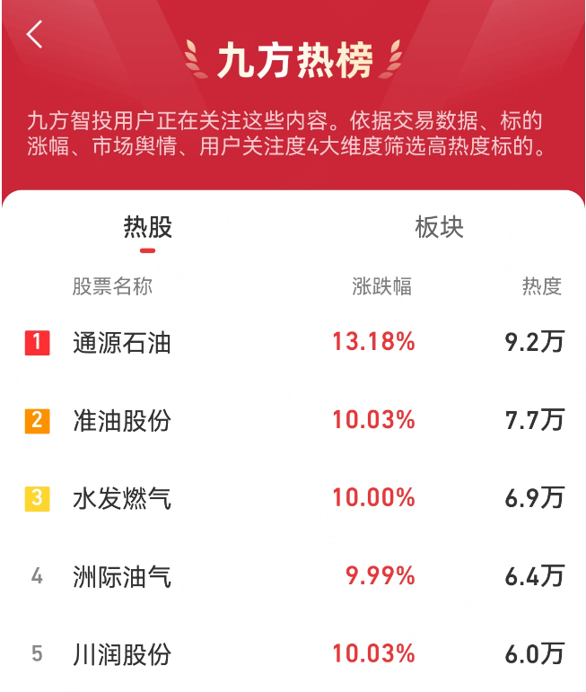 九方热榜:通源石油,准油股份,水发燃气,洲际油气,川润股份
