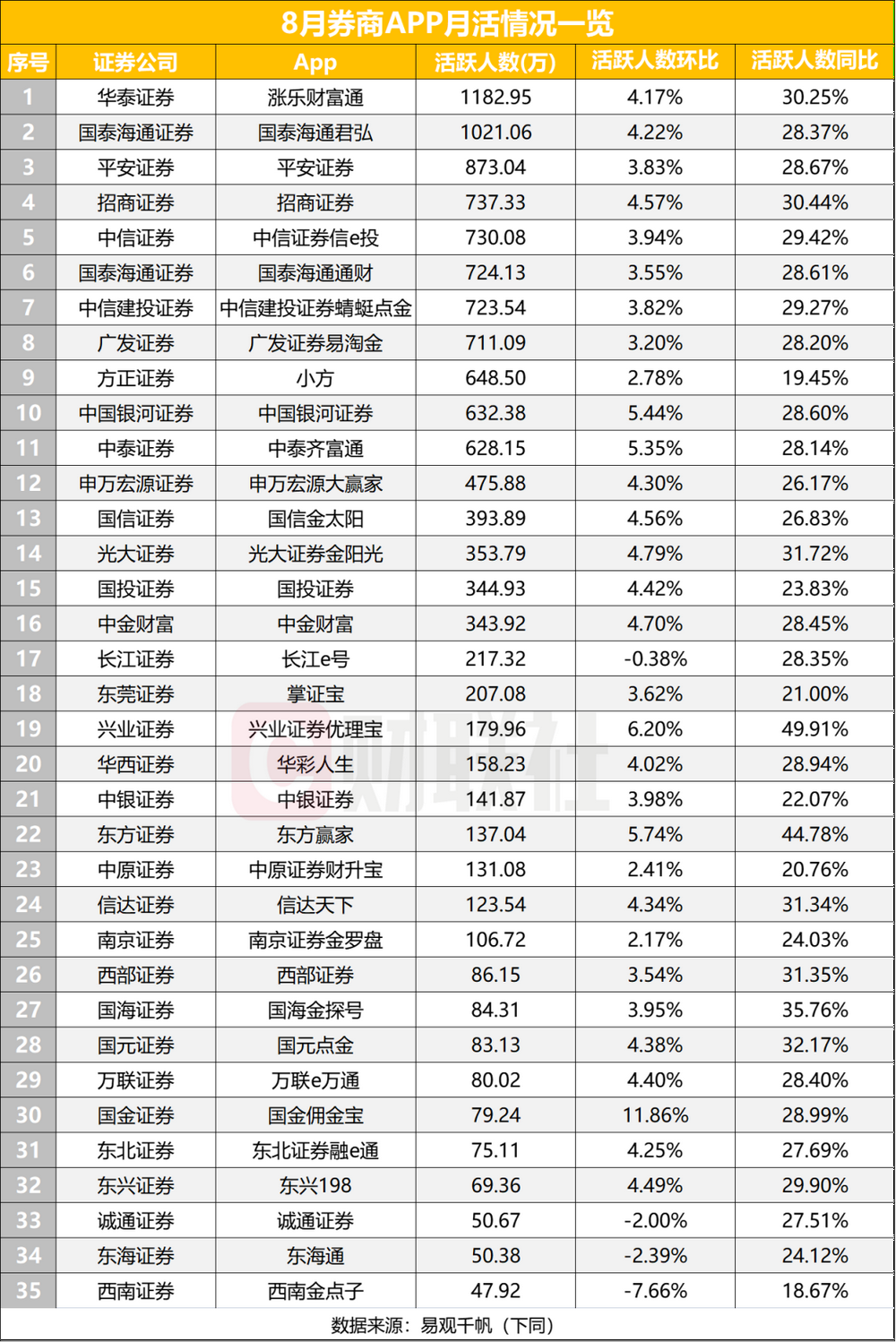 中小券商表现突出。兴业证券优理宝月活跃人数以49.91%的同比增速位居榜首,东方证券东方赢家紧随其后,活跃人数同比增长44.78%。为8月同比增幅最高的两家券商。