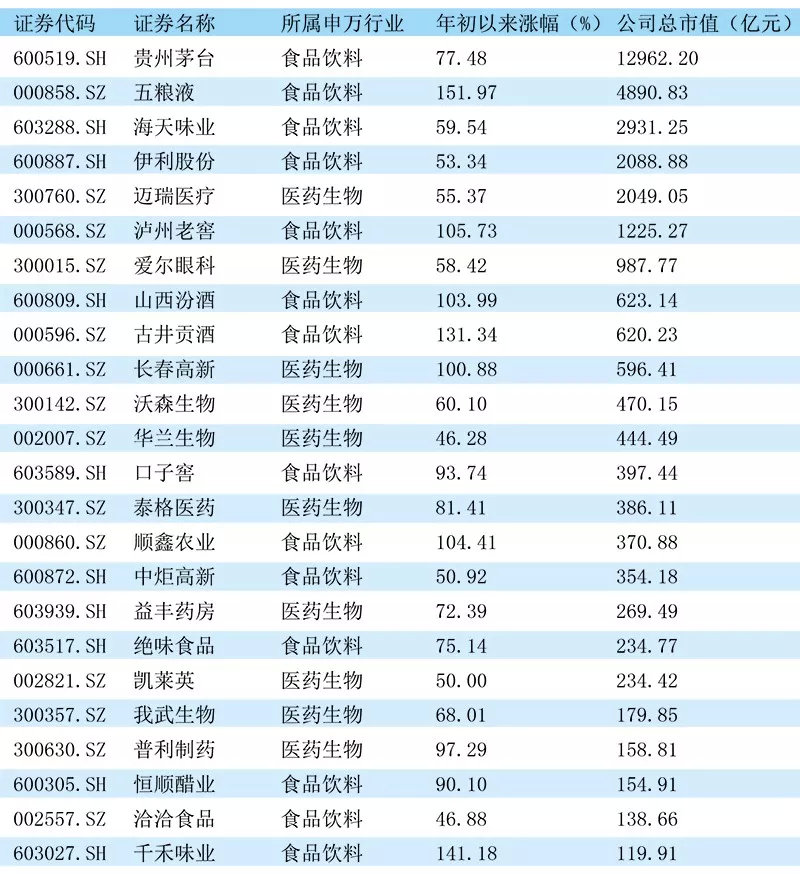 贵州茅台的示范效应鼓舞了整个白酒板块,五粮液、泸州老窖、古井贡酒、山西汾酒、口子窖等一批白酒股全部刷新历史新高,申万白酒行业指数年初以来整体涨幅扩大至87.39%。