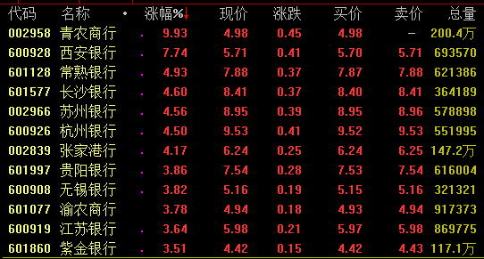 银行板块今日盘中发力走高,截至收盘,青农商行涨停,西安银行涨近8%,常熟银行、长沙银行、苏州银行、杭州银行、张家港行等涨幅超4%。