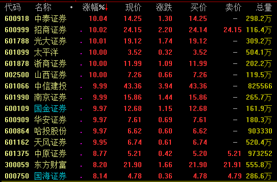 近日表现活跃的券商板块今日盘中再度爆发,截至收盘,中泰证券、招商证券、光大证券、浙商证券、中信建投、南京证券、国金证券等涨停。