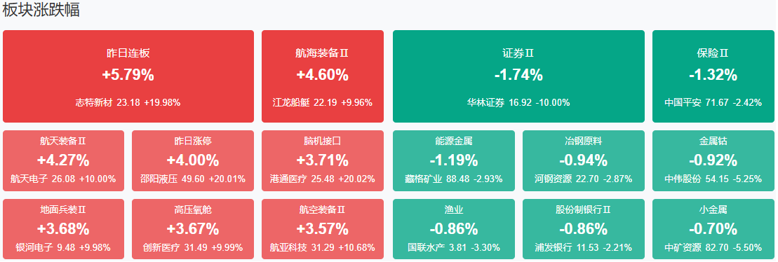 早盘三大指数涨跌不一,沪指翻红,深成指跌幅收窄。沪深两市半日成交额1.77万亿,较上个交易日缩量701亿。盘面上热点快速轮动,全市场超3700只个股上涨,其中有80只个股涨停。从板块来看,商业航天概念反复活跃,十余只成分股涨停,鲁信创投10天8板,银河电子4连板,通宇通讯2连板。AI应用概念爆发,汉得信息、久其软件、宝信软件等多股涨停。脑机接口概念走强,创新医疗、普利特、南京熊猫4连板。可控核聚变概念表现活跃,中国一重、国机重装、中国核建2连板。下跌方面,证券板块走弱,华林证券触及跌停。