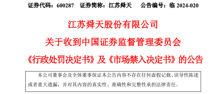 江苏舜天7月5日晚公告,公司及相关当事人收到中国证监会江苏证监局下发的《行政处罚决定书》,江苏证监局决定对公司责令改正,给予警告,并处以1000万元罚款;对高松、桂生春等当事人给予警告并处以不同金额罚款。同时,高松被采取3年证券市场禁入措施。