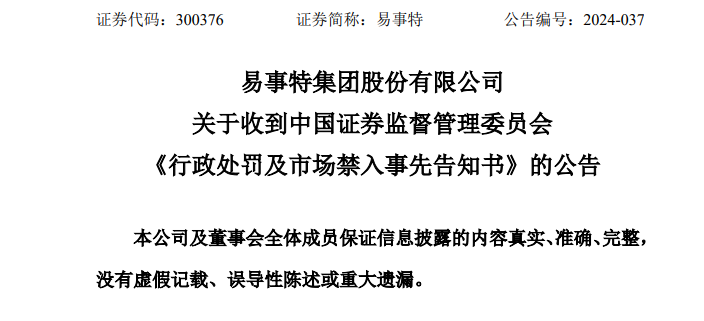 易事特同日公告,公司及相关责任人收到证监会出具的《行政处罚及市场禁入事先告知书》。因公司2017年至2021年年度报告存在虚假记载,股票交易将被实施其他风险警示。公司股票自2024年7月8日开市起停牌1天,自2024年7月9日开市起复牌;公司股票自2024年7月9日起被实施“其他风险警示”,股票简称由“易事特”变更为“ST易事特”。