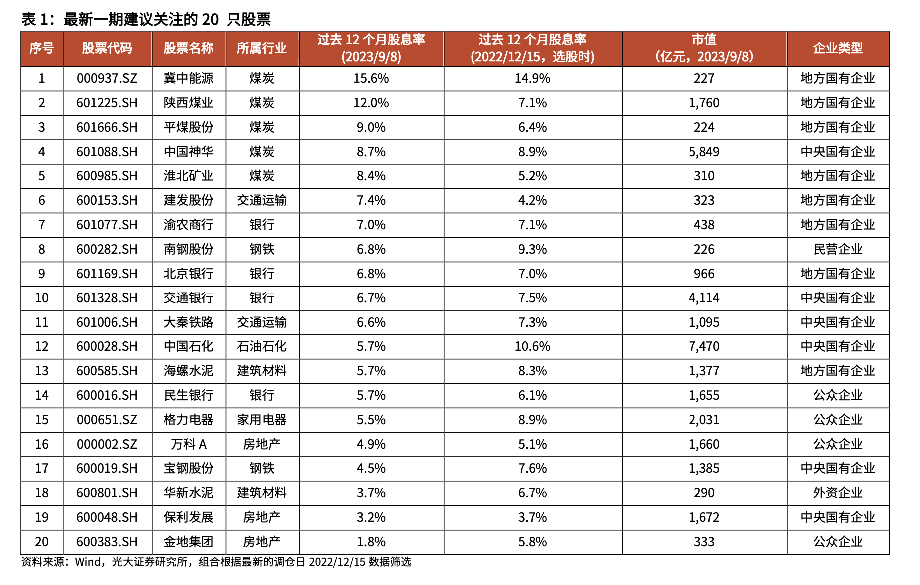 光大证券张宇生在9月9日研报中指出,根据中证红利指数为基准构建的新高股息组合历史数据显示,新组合表现显著优于中证红利指数。高股息板块当前仍然值得关注,因此我们也列示了高股息组合的最新标的,最新一期建议关注的20只股票分别是冀中能源、陕西煤业、平煤股份、中国神华、淮北矿业、建发股份、渝农商行、南钢股份、北京银行、交通银行、大秦铁路、中国石化、海螺水泥、民生银行、格力电器、万科A、宝钢股份、华新水泥、保利发展、金地集团。