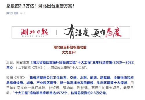 据湖北日报,近日,湖北省印发《湖北省疫后重振补短板强功能“十大工程”三年行动方案(2020—2022年)》(以下简称《方案》),启动疫后重振“十大工程”。这十大工程主要包括公共卫生体系、交通、水利、能源、新基建、冷链物流和应急储备设施、城市、产业园区提升、新一轮高标准农田建设、生态环境等,“十大工程”滚动项目库项目达4572个,估算总投资约2.3万亿元。