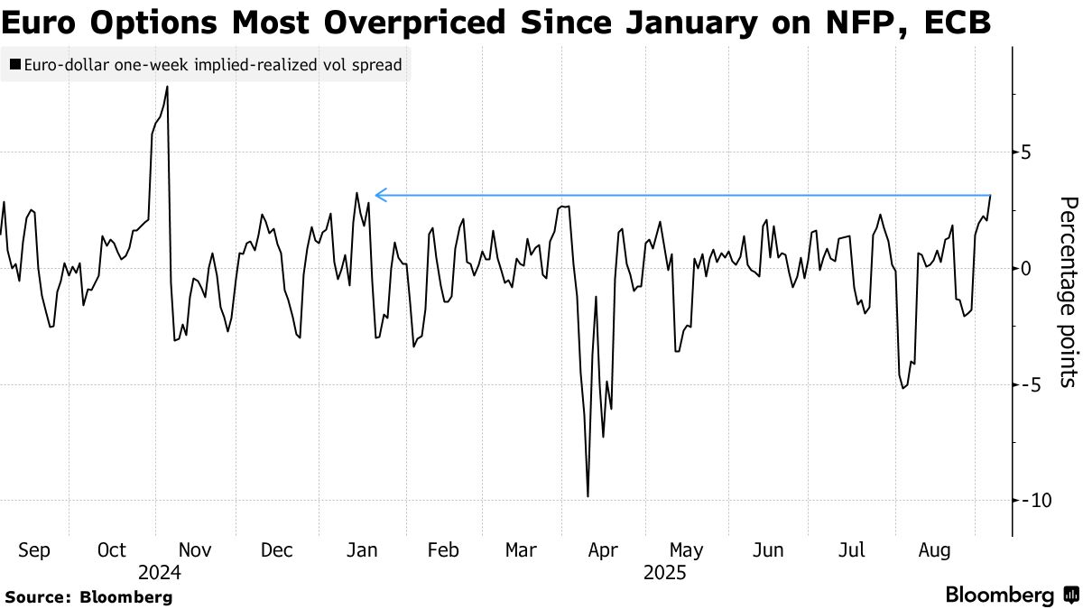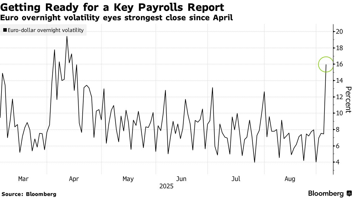 周四,欧元兑美元的一日隐含波动率升至6月以来的最高水平,并有望创下自4月以来的最强收盘水平。这一波动率跳升反映出非农就业数据的重要性——交易员需要借此来判断美联储的下一步行动。在美联储主席鲍威尔上月的讲话中,他曾表示,“就业的下行风险正在上升”。而周三公布的数据则显示,美国7月职位空缺降至10个月低点,这使得周五的非农就业报告更受关注。如果周五公布的就业数据表现疲软,可能会助长市场对美联储更大幅度降息的押注,从而推动美元走软。