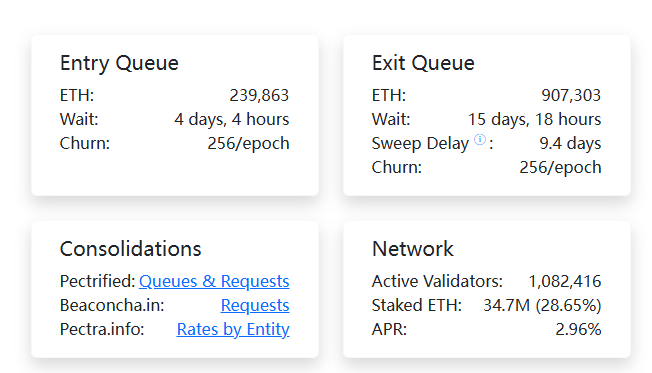 Beaconch.in数据显示,目前以太币的退出队列中已有超过90万枚以太币在等待赎回,等待时间也被拉长至15天18个小时,创下历史新高。
