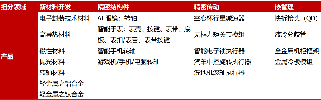 华研科技成立于2016年,致力于为客户提供一站式精密金属及陶瓷零组件整体解决方案。华研科技产品服务涵盖新材料开发、精密结构件、精密传动及热管理等;应用领域涵盖消费电子(AI 眼镜、智能手机、智能手表)、医疗健康、汽车工业、智能机器人、AI数据中心(CDU、UQD、液冷分水器、液冷板)等。经过多年的发展,华研科技已经具备强大的垂直整合、材料研发和精密模组设计及制造能力,华研科技在折叠手机转轴、手表结构件和智能眼镜转轴模组的设计及制造方面具有技术和客户优势,主要终端客户涵盖谷歌、三星、META、亚马逊、微软、索尼等全球知名品牌客户。