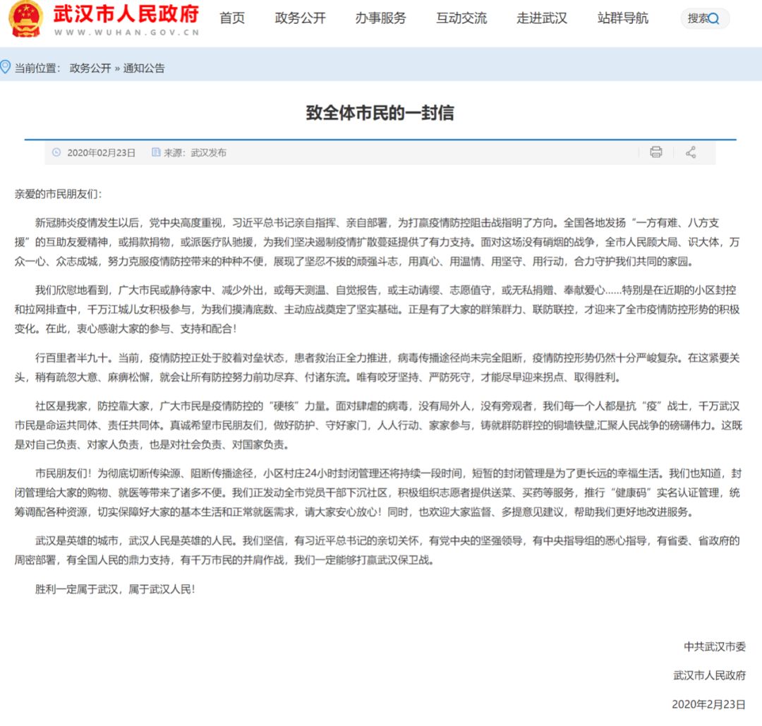 2月23日,武汉市委市政府通过官网、官微等渠道向全体武汉市民发出一封信。