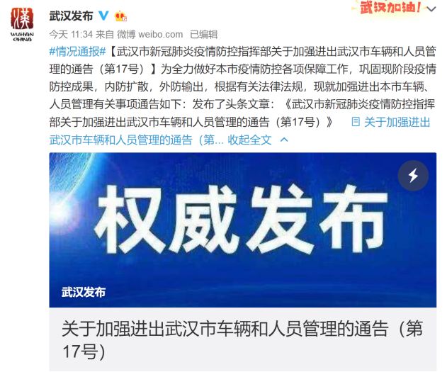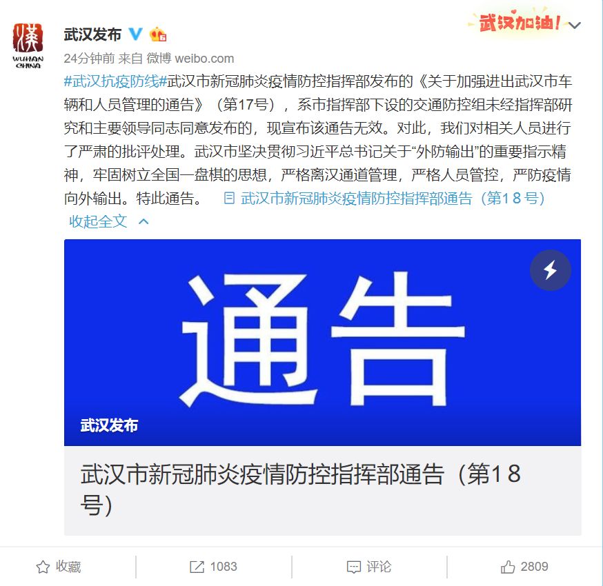 武汉发布微博2月24日消息,武汉市新冠肺炎疫情防控指挥部发布的《关于加强进出武汉市车辆和人员管理的通告》(第17号),系市指挥部下设的交通防控组未经指挥部研究和主要领导同志同意发布的,现宣布该通告无效。