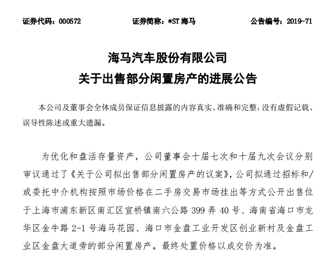 临近年底,已经有多家上市公司加入到卖房大军当中,*ST海马就是其中一家。今日,据一财报道称,*ST海马回应称通过卖房子卖股权,有望保壳成功。
