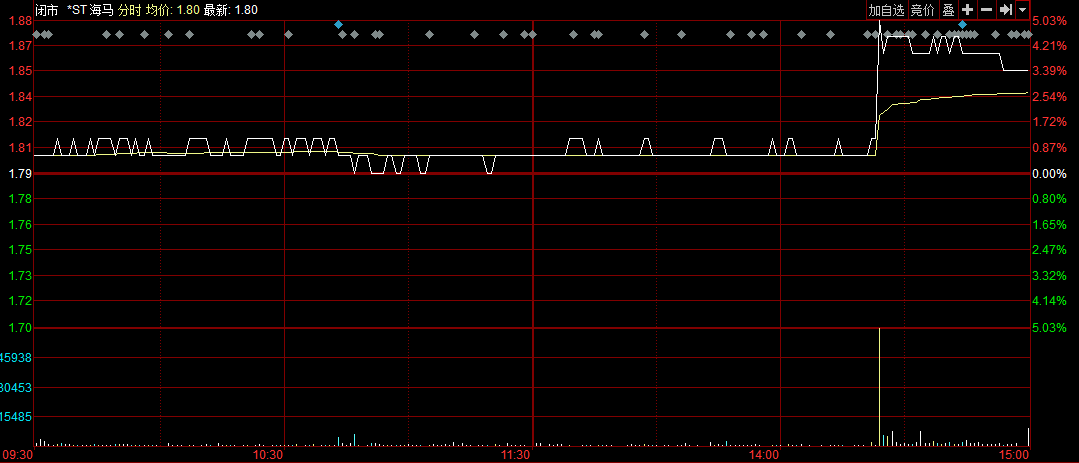消息公布后,*ST海马股价快速拉升,触板后有所回落。截至今日收盘,*ST海马上涨3.35%,报1.85元/股。