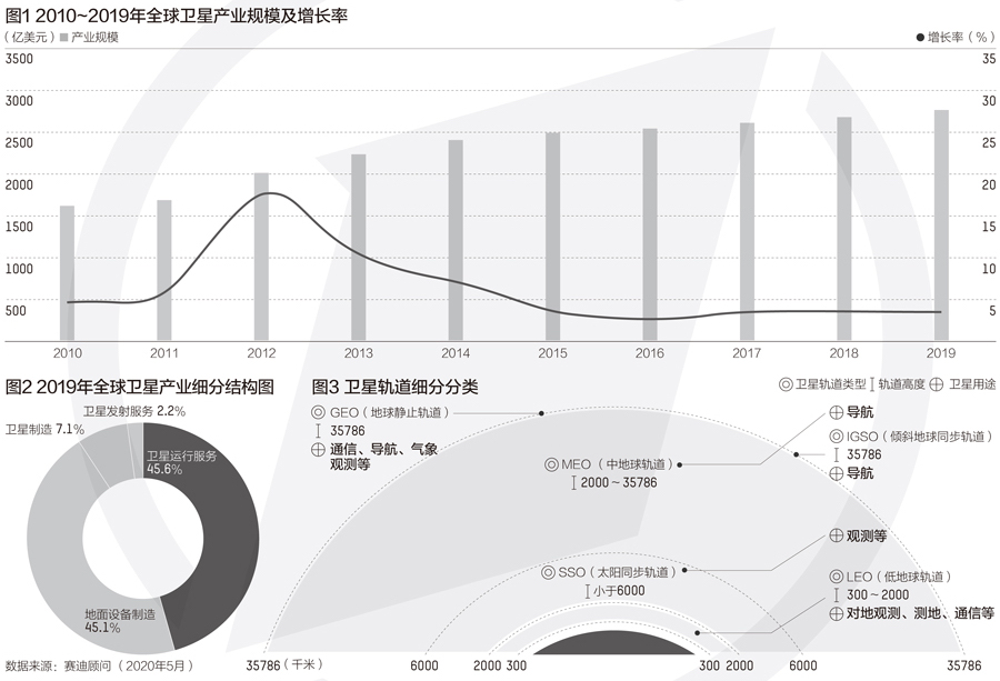 2019年,全球卫星产业总收入为2860亿美元,同比增长3.2%。