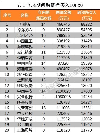 此前抱团白马集体回调之际,舆论多出现“掉坑”、“抱团瓦解”等字样,但具备前瞻属性的两融资金却在此时加仓大消费,确实令人很意外。个股:近9亿爆买五粮液而个股方面,年内频创新高的抱团股,也在同期获得了融资资金的积极加仓。东方财富Choice数据显示,7.1-7.4期间,融资净买入最多的20只个股中,白马股占了绝大多数,其中部分更是股价在年内叠创新高的抱团白马。比如融资净买入排名第一的是五粮液,获得8.8亿额度的净买入,贵州茅台获得5.3亿,排名第3,立讯精密、恒瑞医药、中国国旅、上海机场、中国平安、长春高新、兴业银行这些年内频创新高的个股也分别获得了过亿的净买入额。