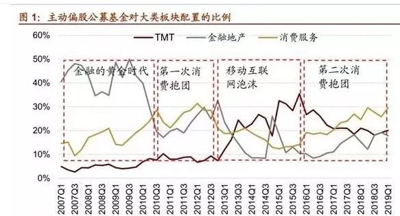 按照招商证券的定义,持续加仓并持有一个板块接近至超过30%,视为“抱团”。类似的情况发生过四次,分别是:2007Q1-2010Q1 抱团金融持续13个季度;2009Q3-2012Q3 第一次消费抱团持续13个季度;2013Q1-2016Q1 抱团信息科技持续13个季度;如果从2017Q1算正式开始抱团,目前只持续了10个季度。