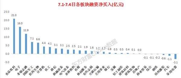 白马行情能否延续,尤其是抱团白马会否瓦解,是7月以来近几个交易日市场机构热议的话题。杠杆资金爆买大消费而当市场在争论不休之际,两融资金却在“高位”抄底了大消费板块,着实令人感到意外!两融资金由于具备杠杆属性,承担了超出普通投资人风险,因此往往被认为偏好短炒题材股、妖股。但7月开局以来,它们却开始爆买别人眼中的“高价”抱团白马股。板块:21亿“接盘”食品饮料东方财富Choice数据显示,7.1-7.4期间,申万28个一级行业中,食品饮料获得21亿元的融资净买入;电子、非银金融也分别获得超10亿元净买入;国防军工、医药生物净买额超6亿元;计算机、化工、通信、机械设备、电气设备、农林牧渔、传媒净买超2亿元。