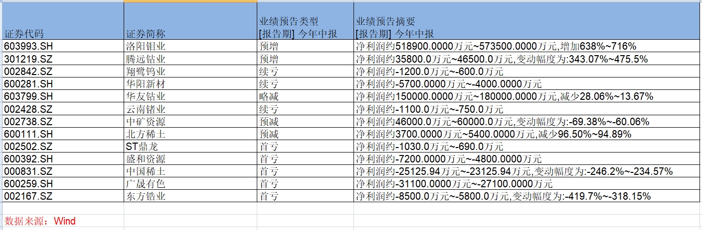 除了钴行业,其他小金属企业业绩并不乐观。包括钼、稀土、锗、镐等概念的多只个股中期业绩录得亏损。
