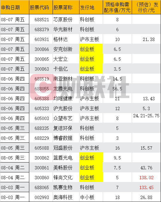 科创板中,8月3日发行的凯赛生物,和8月6日发行的龙腾光电值得关注。