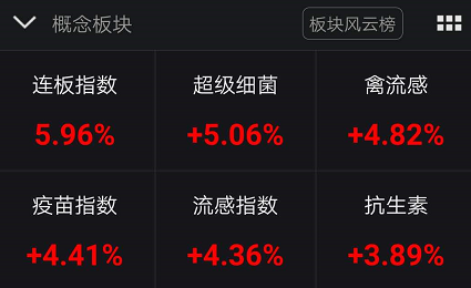 盘面上,生物疫苗指数强势上攻,盘中一度涨超4%以上,新冠肺炎检测指数、超级细菌指数、流感指数、抗生素指数等相关题材集体大涨,医药股更是全面爆发。