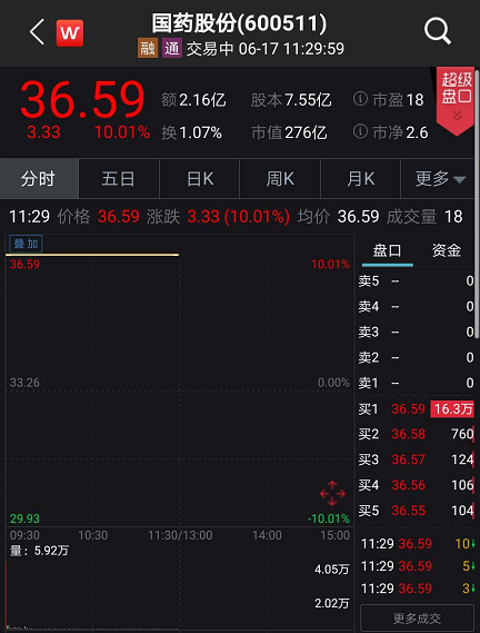 当天上午,国药股份强势一字涨停,截至午盘收盘,股价报收36.59元,超16万手仍然封在涨停板上。