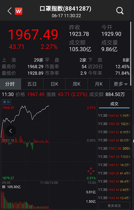 值得注意的是,受疫情局势变化的影响,一度出现深度回调的口罩股悄然中再度走强,当天口罩股指数大涨超2%以上。