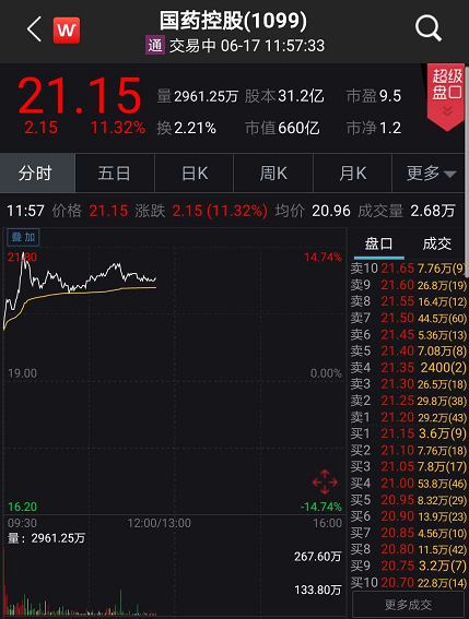 同时,港股上市公司国药控股也出现了同步大涨。6月17日早盘,国药控股股价一度涨超14%,最高触及21.80港元。临近午间收盘,国药控股股价依旧涨超11%。
