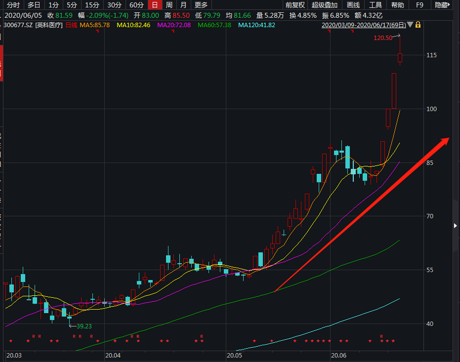 数据显示,从5月12日至今,一个多月时间,英科医疗从53元左右涨至最高120.50元,涨幅已经超120%以上,年内涨幅更是涨超580%。妥妥的一只大牛股。