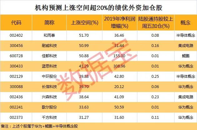 上述外资加仓的绩优股,同时也获得了机构的青睐。统计显示,本周获北上资金加仓,2019年度净利润增幅超20%,且机构预测还有20%以上的上涨空间股仅有9只。