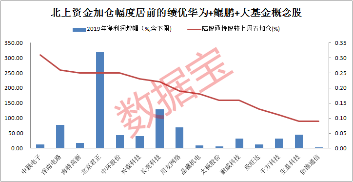 进一步来看,以上60股中2019年度净利润实现增长股有32只。从加仓幅度来看,本周加仓居前的华为+鲲鹏+半导体概念股有中颖电子、深南电路、海特高新,最新陆股通持股较上周五分别增加0.31%、0.26%及0.25%;其中中颖电子同时具备半导体、集成电路概念。另外,北京君正、中环股份、兴森科技等4股也获得了0.2%以上的加仓。