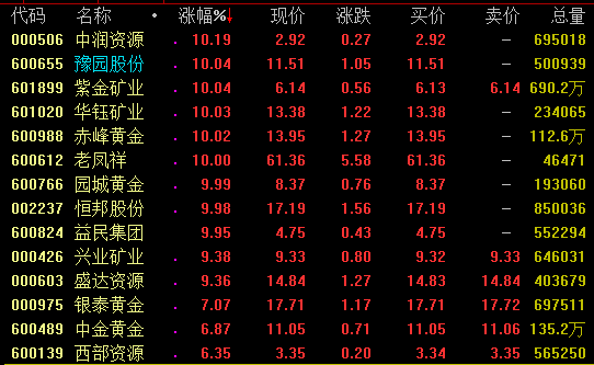 黄金概念今日盘中大幅拉升走高,截至收盘,中润资源、豫园股份、紫金矿业、华钰矿业、赤峰黄金、老凤祥、园城黄金、恒邦股份、益民集团等涨停。