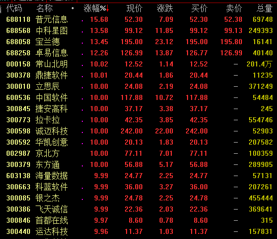软件类个股今日盘中再度大幅拉升,截至收盘,普元信息、中中科星图、卓翼信息、宝兰德等涨幅超10%,常山北明、鼎捷软件、中国软件、捷安高科、诚迈科技、京北方、海量数据、飞天诚信等涨停。