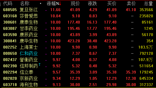 医药板块今日盘中走势强劲,截至收盘,复旦张江涨幅超11%,莎普爱思、康泰生物、甘李药业、康辰药业、康华生物、上海莱士、仁和药业、誉衡药业等涨停。