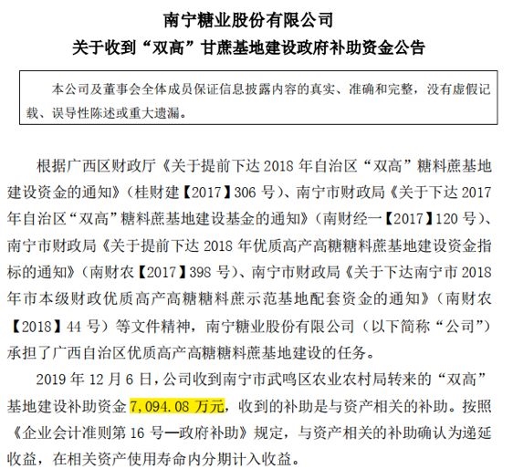 *ST南糖12月9日晚发布公告称,12月6日,公司收到南宁市武鸣区农业农村局转来的“双高”基地建设补助资金7094.08万元,是与资产相关的补助。按照相关规定,与资产相关的补助确认为递延收益,在相关资产使用寿命内分期计入收益。本次公告的政府补助会对公司2019年度利润产生一定影响。